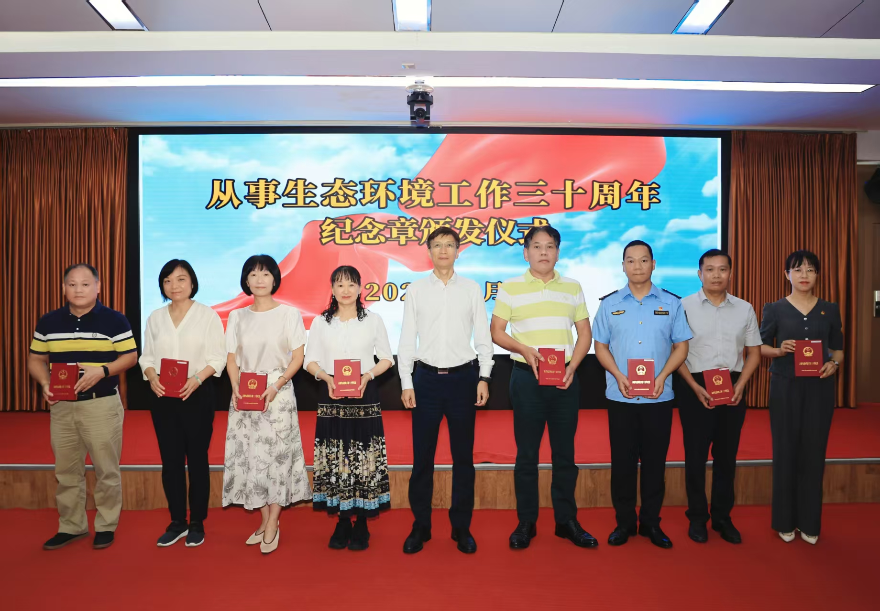活動以2025年度生態環境部“從事生態環境工作30年紀念章”頒發儀式拉開序幕,局黨組書記、局長王保森為28名獲得榮譽的環保工作者代表頒發紀念章,他們用三十年的堅守,用腳步丈量山河,用責任守護云山珠水,將最美好的年華化作了這座城市最動人的生態底色。