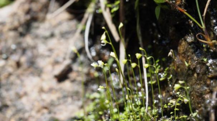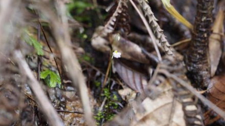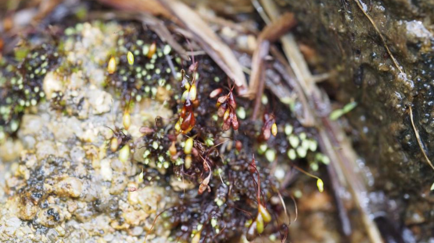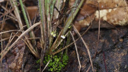 起初調查人員誤以為附著在巖石上的是一些苔蘚,但隨著“頸卵器”下方的一點點小綠葉擠入眼簾,我們發現事情并不簡單,接著我們就注意到這些結成串的東西,才確認了這確實就是貍藻屬的植物——圓葉挖耳草。