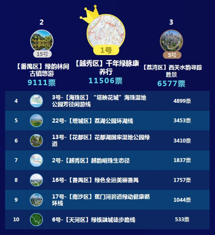 由廣州市生態環境局、廣州市衛生健康委員會指導,廣州市環境保護宣傳教育中心、廣州市疾病預防控制中心(廣州市衛生監督所)聯合舉辦的“美麗+健康”羊城最美徒步路線公眾推選活動,自9月份啟動以來,共吸引近10萬人次熱情參與。經過激烈票選,10條由公眾推選的最具人氣、最具魅力的首批羊城最美徒步路線終于出爐啦!