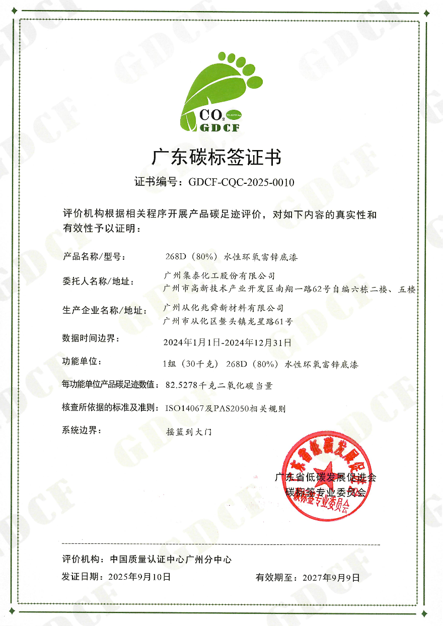 廣州市生態環境局從化分局積極推廣廣東碳標簽應用場景,近日指導廣州集泰化工股份有限公司的“268D(80%)水性環氧富鋅底漆”產品開展了全生命周期碳足跡核算。經核定,該產品每功能單位的碳足跡為82.5278千克二氧化碳當量,經評價機構依據相關程序開展產品碳足跡評價,該產品成功取得碳標簽證書。此前從化分局陸續指導了從化區獲得首張荔枝產品碳標簽證書;指導萬力輪胎股份有限公司成為國內輪胎行業中首家獲得新能源乘用車胎碳標簽證書的企業,并發布行業首個《新能源乘用車輪胎產品碳足跡評價技術規范》團體標準。