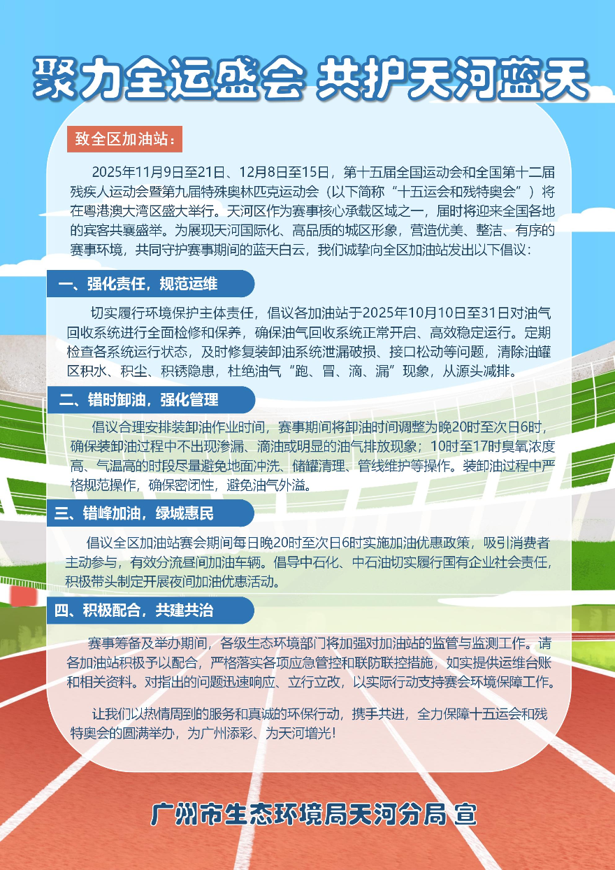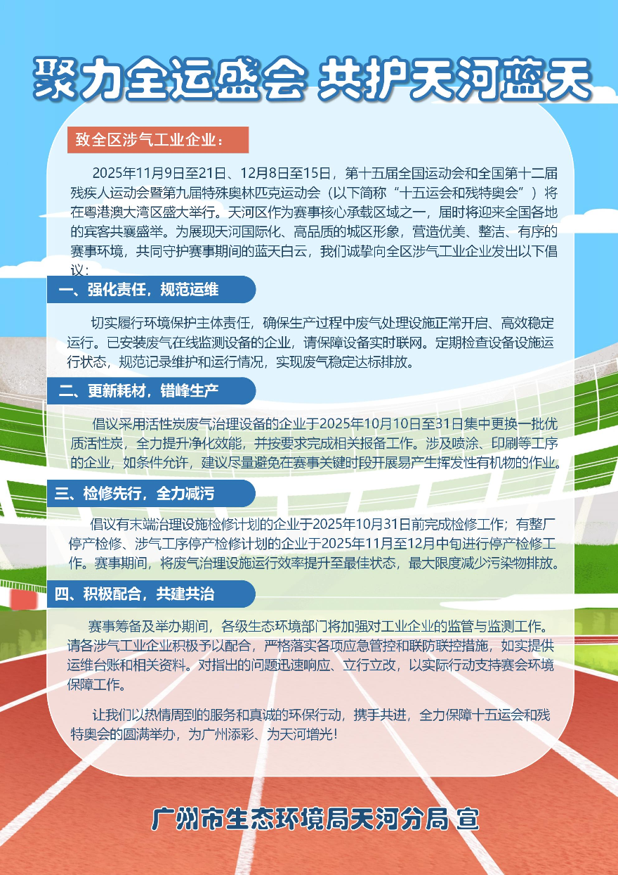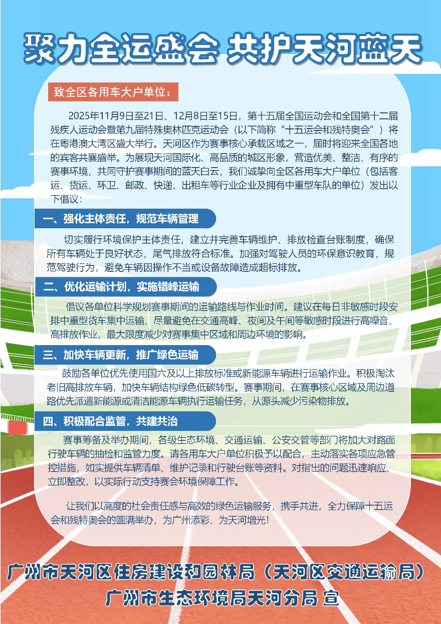 近日,為全力保障十五運會和殘特奧會期間的環境空氣質量,廣州市生態環境局天河分局、天河區住房建設和園林局(區交通運輸局)、天河區城市管理和綜合執法局針對與空氣質量息息相關的五類重點對象,共同發出《聚力全運盛會 共護天河藍天》系列倡議書,變“監管”為“共治”,化“要求”為“邀請”。