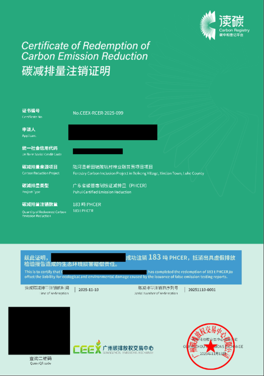 賠償修復(fù)階段,天河分局突破傳統(tǒng)修復(fù)模式局限,首次引入“認(rèn)購經(jīng)核證的廣東省碳普惠減排量”作為替代性修復(fù)手段。涉案企業(yè)通過廣東省碳普惠平臺認(rèn)購減排量,資金定向支持光伏、林業(yè)碳匯等低碳項目,間接實現(xiàn)大氣環(huán)境效益補(bǔ)償。