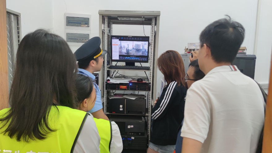 ▲執(zhí)法人員現(xiàn)場查看車輛檢測過程監(jiān)控視頻