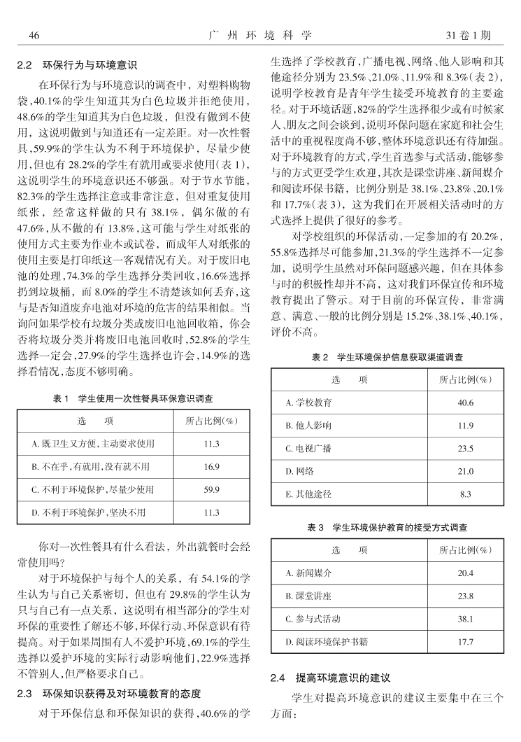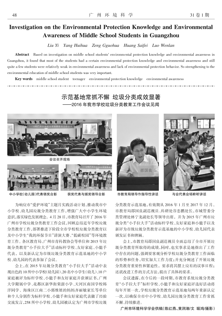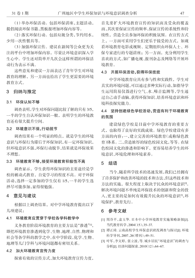 廣州地區中學生環保知識與環境意識調查分析……劉一,楊慧華,曾國華,等(45)