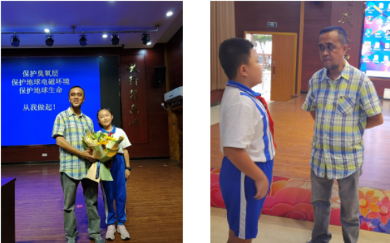 活動最后,五年5班的周子虞代表同學們為韓老師獻上了美麗的鮮花表示感謝。還有同學不舍得離開會場,跟韓老師繼續提問和探討地球臭氧層的保護問題呢!