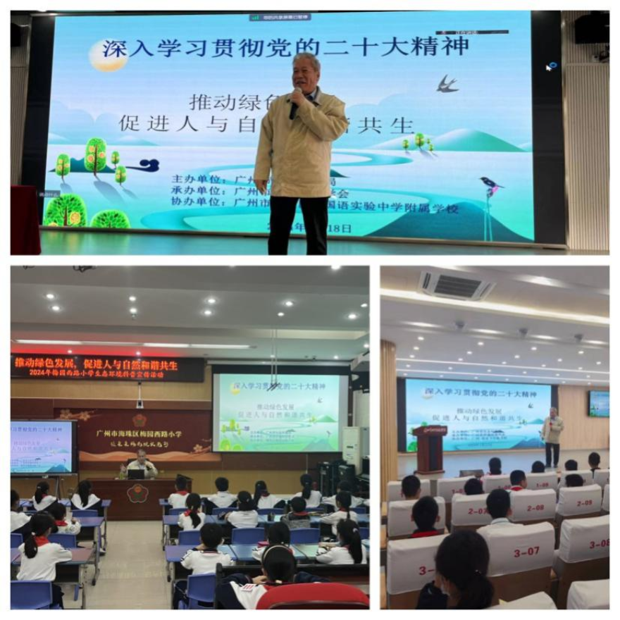 為提高青少年對黨的二十大的生態文明理念的理解,提升他們對綠色低碳意識和社會責任,今年1月,在市生態環境局指導下,市環境科學學會分別在海珠區梅園西路小學、廣州市五中東曉學校和海珠區外國語實驗中學附屬學校,開展了以“推動綠色發展 促進人與自然和諧共生”為主題的生態環境科普講座。講座以線上+線下形式相結合,其中線下444人,線上1349人。