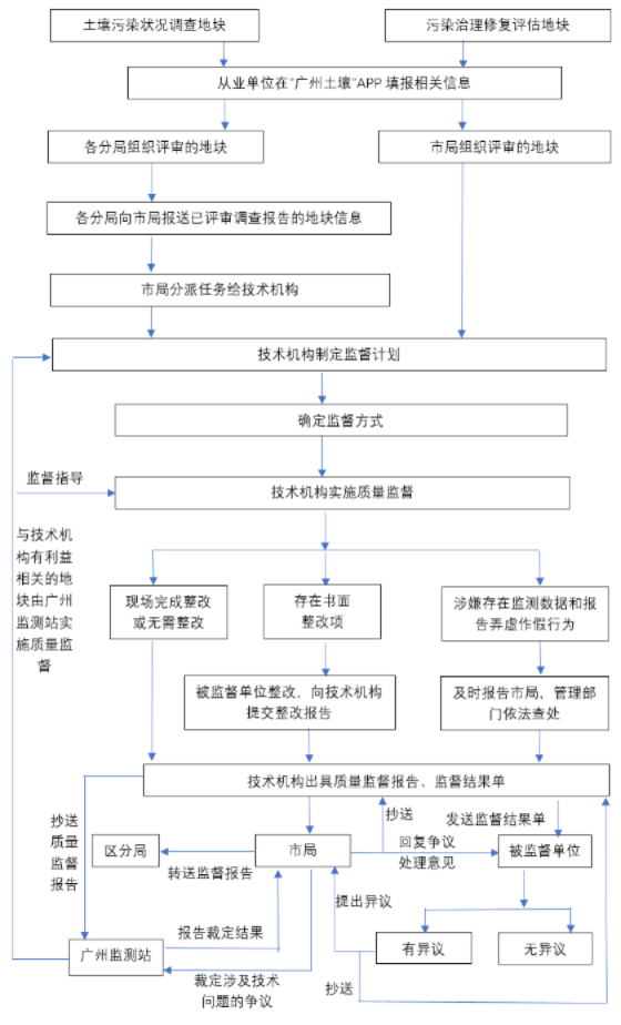 市生態環境局組織實施土壤污染狀況調查、修復效果評估的質量監督工作。廣東省廣州生態環境監測中心站(以下簡稱“廣州監測站”)對技術機構的質量監督工作進行監督,并對質量監督中涉及監測技術問題的爭議進行裁定。