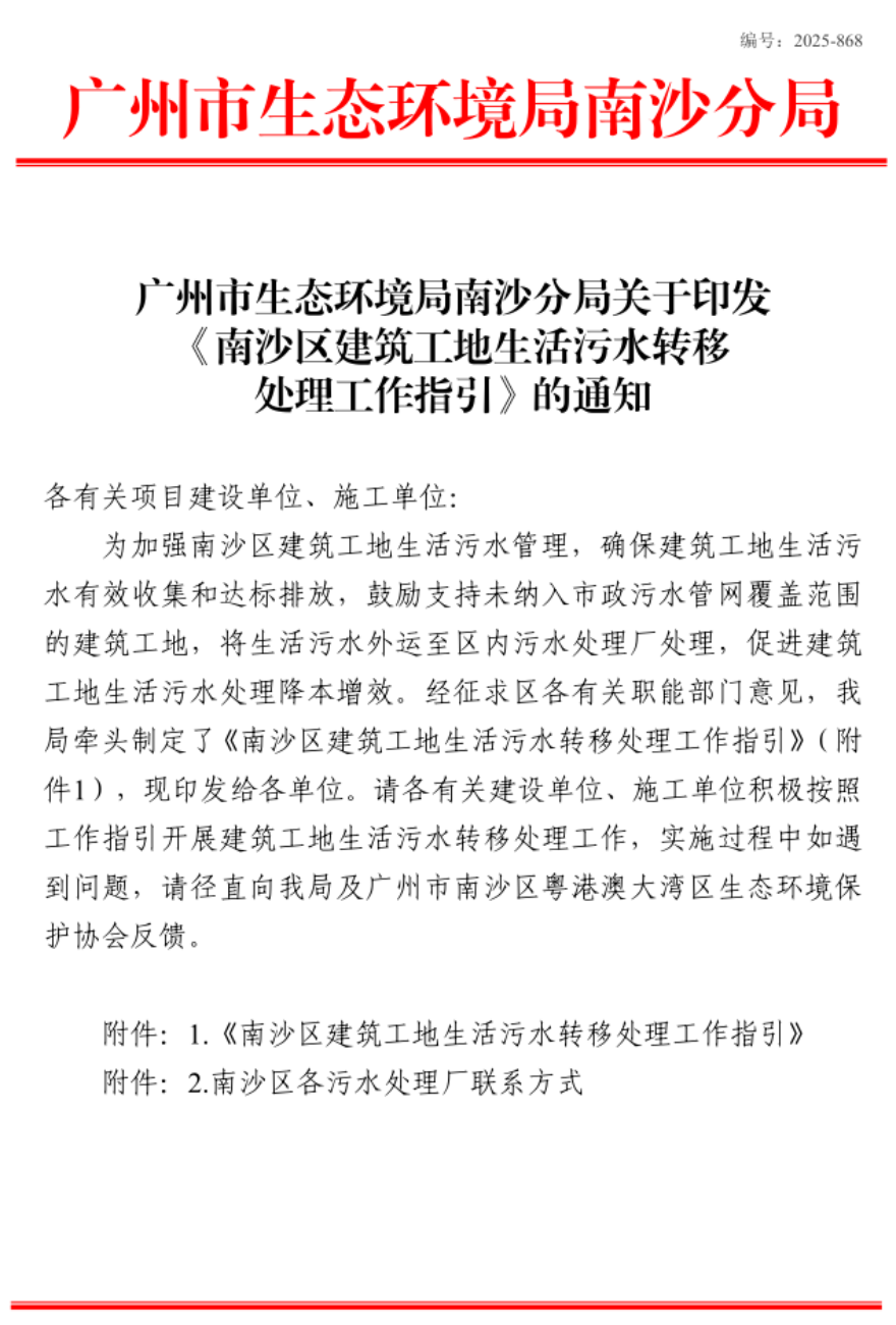針對轄區建筑工地數量多、單獨配套生活污水處理設施建設和運行成本高,以及日常監管中發現部分工地的生活污水處理設施難以正常運行、污水不能穩定達標排放等問題,近日廣州市生態環境局南沙分局牽頭制定了《南沙區建筑工地生活污水轉移處理工作指引》,鼓勵支持未納入市政污水管網覆蓋范圍的建筑工地將生活污水外運至區內污水處理廠處理,促進建筑工地生活污水處理降本增效,解決工地生活污水治理出路問題。