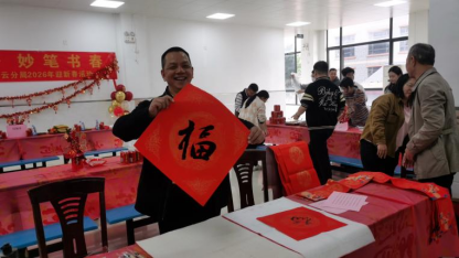 “揮春”環節墨香四溢。干部職工紛紛提筆體驗,在紅紙上寫下對工作的熱愛和對新年的期許,并邀請書法老師現場指導并揮毫助興。亮點就在于春聯內容的“私人定制”:各科室結合自身業務特色與新年目標,共同創作對聯。如:寓意統籌謀劃的辦公室春聯“經緯文樞謀遠略 風清氣正啟新元”,描繪生態愿景的監管一科春聯“云山珠水舒畫卷 美麗白云展新顏”,筆墨之間,既有傳統文化的雅致,更有守護綠水青山的情懷。