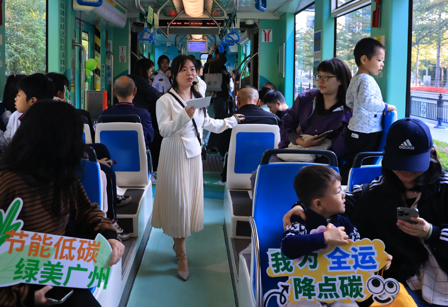 站臺邊,一列以淺綠色為主色調的有軌電車靜候發(fā)車。車身繪有綻放的木棉、翩飛的白鷺、躍動的海豚,與廣州塔、五羊石像等城市意象交融,如同一幅“云山珠水、萬物共生”的生態(tài)畫卷徐徐展開。參與者們在工作人員的引導下有序登車,車輪輕響中,這列“會移動的生態(tài)課堂”正式啟程。