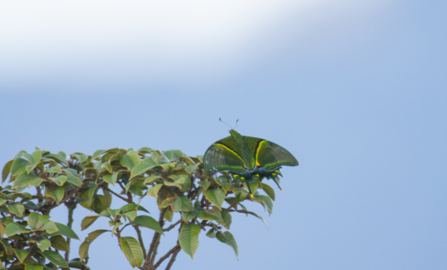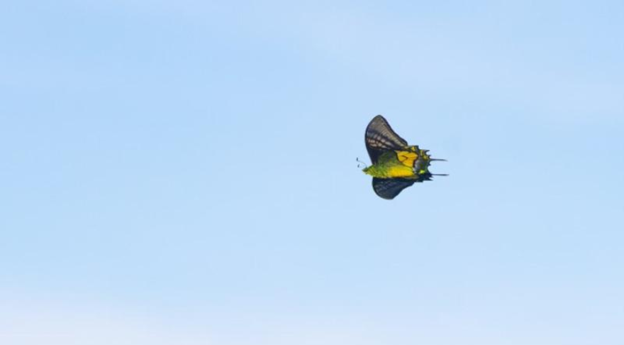 據調查團隊介紹,此次觀測地點位于近千米的山峰,現場記錄的金斑喙鳳蝶成蟲形態特征清晰可辨:前翅金黃色斑帶和后翅中央金黃色斑紋交相輝映,尾狀突出細長且末端金黃,飛行時姿態優美靈動,符合“蝶中皇后”的典型特征。