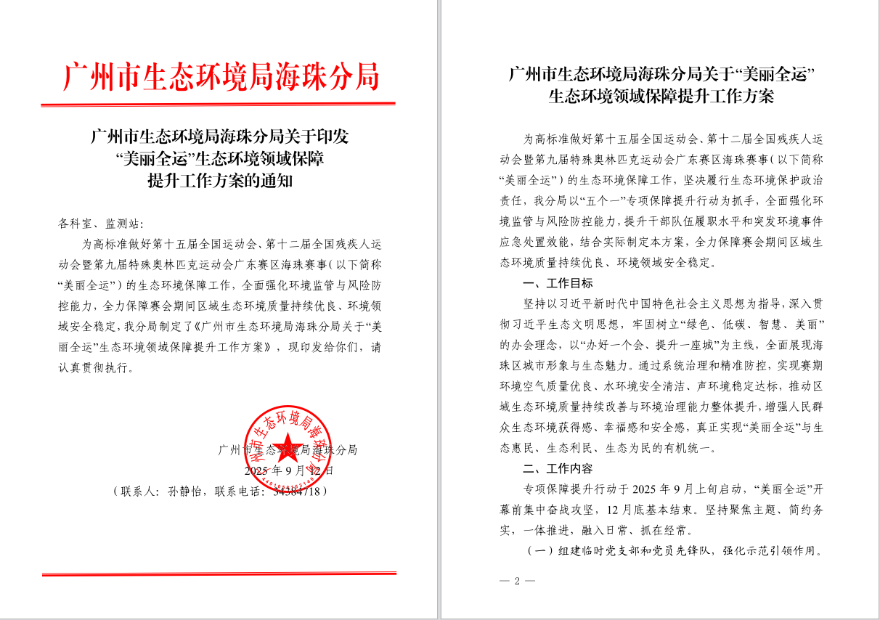 為迎接第十五屆全運會和殘特奧會海珠賽區賽事,廣州市生態環境局海珠分局主動靠前、系統謀劃,印發實施《“美麗全運”生態環境領域保障提升工作方案》,創新推出以“一支先鋒隊、一輪大培訓、一場大演練、一次大調處、一套新機制”為核心的“五個一”專項行動,構建起全鏈條、多維度生態環境保障體系,全力守護“廣州藍”“羊城綠”,展現海珠生態治理的硬核擔當。