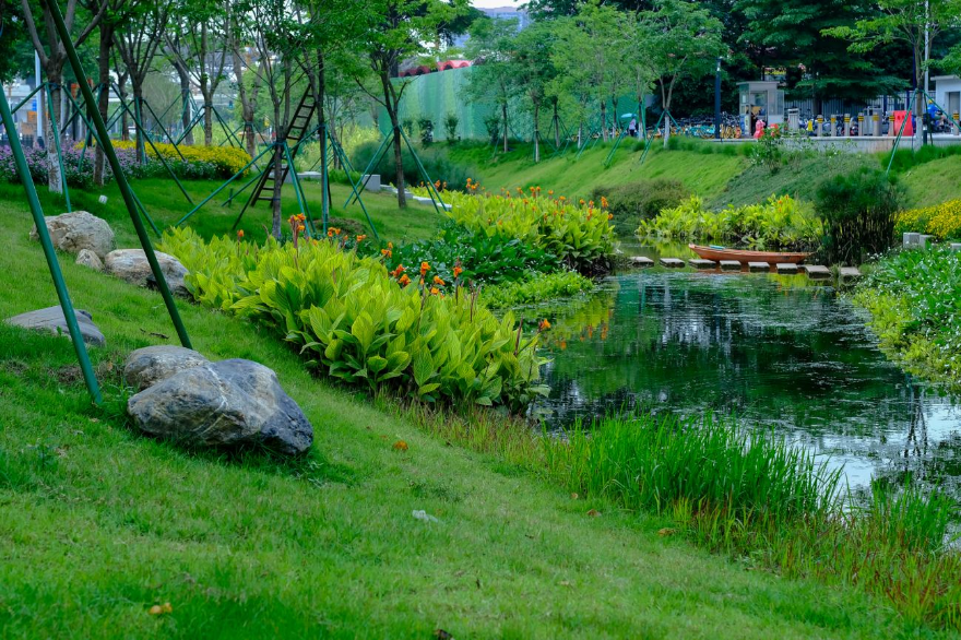 通過源頭截污、雨污分流筑牢治水根基,從根源上切斷污染源頭,成功消除水質黑臭,為打造“綠水青山”奠定堅實基礎。遵循“三易三少”(即易排澇、少淤積,易親水、少維護,易施工、少挖填)原則讓河道重拾蜿蜒自然之態,營造“微生態水灣”,種植水生鳶尾、金邊蘆竹等植物構筑多樣化生物棲息地。“一廊四景”景觀體系串聯起親水平臺與慢行系統,22種花卉與10種喬灌木形成層次分明的生態空間,讓市民實現“推窗見綠、臨水而居”的愿景。生態環境的改善,不僅提升了居民的幸福感和獲得感,也讓區域價值持續提升,彰顯了“兩山”理念的民生溫度。