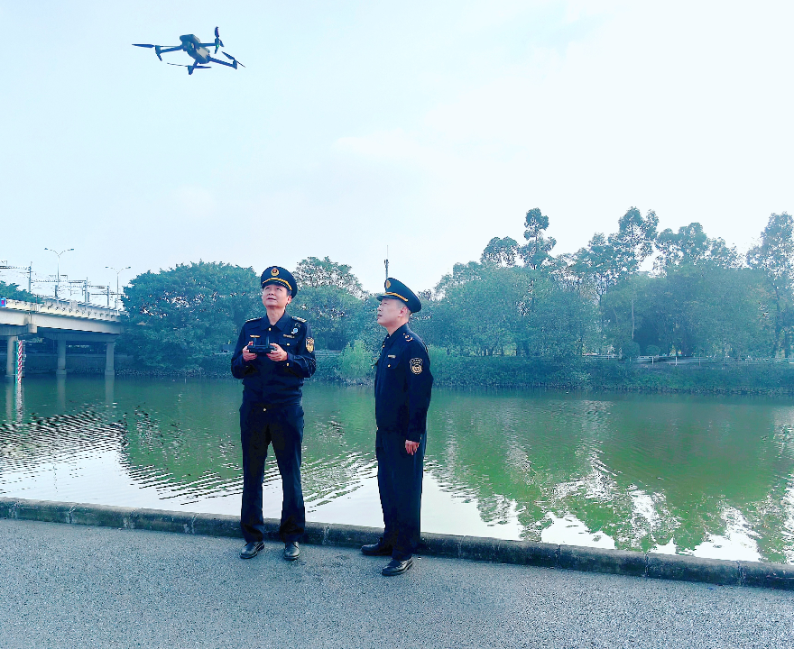 圖1:廣佛兩地執法人員操作無人機開展巡查