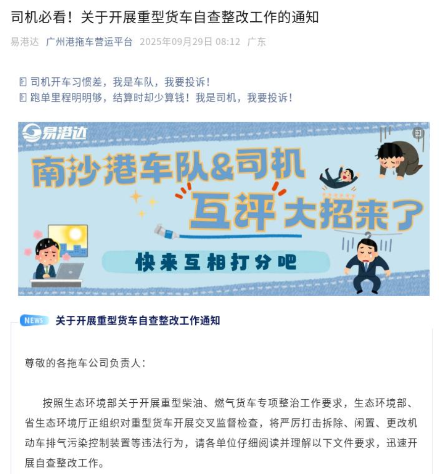 2025年9月,廣州市生態環境局南沙分局委托廣州港拖車運營中心在公眾號平臺發布《關于開展重型車自查整改工作的通知》(以下簡稱《通知》)(https://mp.weixin.qq.com/s/6tfax5uo0Mi8FG--iu-A_w),并通過平臺內部郵件將《通知》發送至各相關拖車公司。