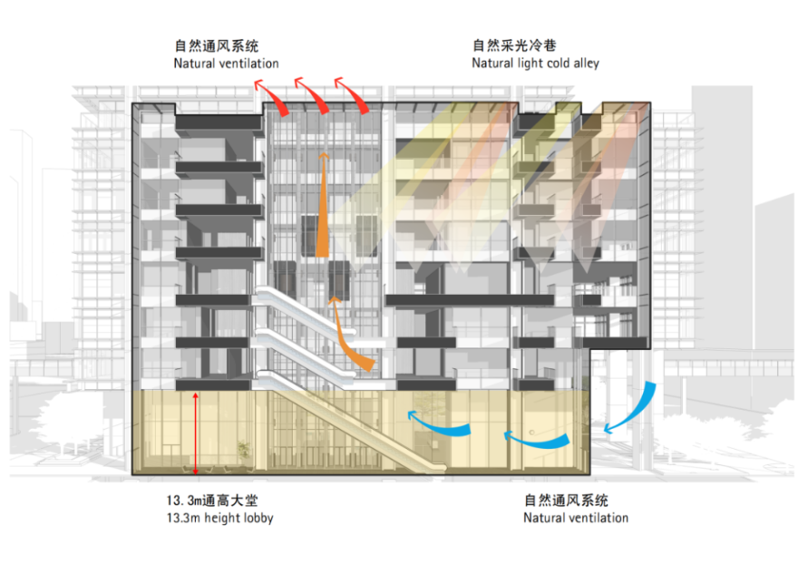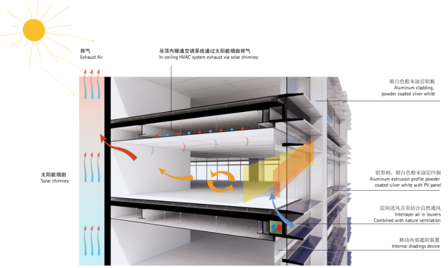 在建設(shè)伊始,天河區(qū)就積極鼓勵中建四局科創(chuàng)大廈從建筑本體節(jié)能、主動能效提升、可再生能源充分利用、運行調(diào)節(jié)與管理、碳清除和碳抵消等5個維度,全面提高建筑節(jié)能降碳水平。在建筑本體節(jié)能方面,設(shè)置太陽能煙囪、冷巷,最大限度地利用自然通風(fēng),同時因地制宜規(guī)劃布局,利用高性能圍護結(jié)構(gòu)、自然采光、遮陽等被動式技術(shù),營造健康室內(nèi)環(huán)境,最大程度降低建筑用能需求。在主動能效提升方面,采用高效制冷機房、新風(fēng)全熱回收、高效智能照明系統(tǒng)、高效電梯等措施,最大程度降低能源消耗。在可再生能源方面,在塔樓屋頂、幕墻橫向裝飾翼以及裙樓屋頂創(chuàng)新性應(yīng)用建筑光伏發(fā)電系統(tǒng),年發(fā)電量約65萬度,年減碳量可達350噸。在運行調(diào)節(jié)與管理方面,搭建智慧物聯(lián)網(wǎng)系統(tǒng),實現(xiàn)智慧管理平臺可視化、能源系統(tǒng)AI優(yōu)化控制,高效開展能源管理數(shù)據(jù)統(tǒng)計分析和預(yù)測工作。在碳清除和碳抵消方面,采用多種形式景觀,充分利用綠化碳匯碳清除效果,運行階段采用綠色電力證書交易的形式,抵消大樓運行階段剩余碳排放,交易期間實現(xiàn)樓宇運行階段凈零碳排放。