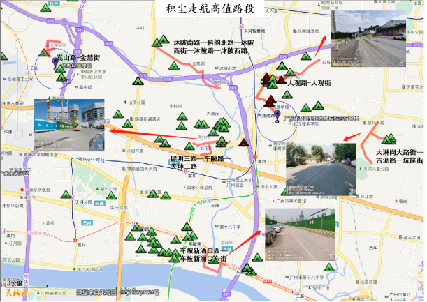 為提高道路揚塵污染防控的針對性和時效性,天河區(qū)利用城市道路積塵走航車監(jiān)測城市主要道路的污染程度,通過快速識別道路積塵負荷的重點區(qū)域、重點道路,為評估道路揚塵污染情況、開展道路揚塵治理提供有力數(shù)據(jù)支撐。天河區(qū)開展道路積塵走航監(jiān)測4次,針對137條重點路段開展積塵負荷走航監(jiān)測,共發(fā)現(xiàn)11條道路積塵高值問題,均及時進行交辦整改。