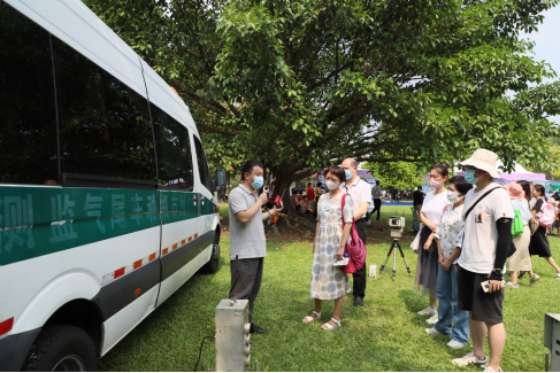 本次活動派出環境監測車向公眾開放展示參觀,車上配置環境監測專業設備,為廣州藍天白云保駕護航;在展位區擺放各種便攜儀器,如:噪聲監測儀、大氣分析儀、水質分析儀等,在專業技術人員對設備進行講解后,吸引不少市民體驗操作,令市民對聲環境、水環境、氣環境有更深認知的同時,也更加了解生態環境監測工作的重要性。