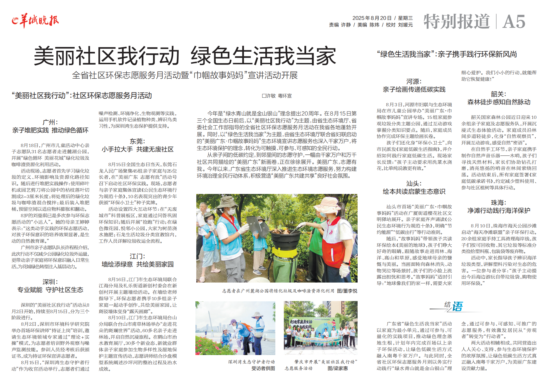 今年是“綠水青山就是金山銀山”理念提出20周年。在8月15日第三個全國生態日前后,以“美麗社區我行動”為主題,由省生態環境廳、省委社會工作部指導的全省社區環保志愿服務月活動在我省各地蓬勃開展。同時,以“綠色生活我當家”為主題,由省生態環境廳聯合省婦聯啟動的“美麗廣東·巾幗故事媽媽”生態環境宣講志愿服務也深入千家萬戶,將生態環境保護的理念,轉化為可觸摸、可參與、可感知的全民行動。