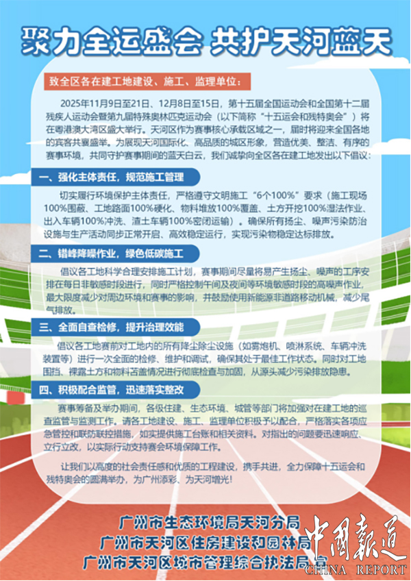 近日,為全力保障十五運會和殘特奧會期間的環境空氣質量,廣州市生態環境局天河分局、天河區住房建設和園林局(區交通運輸局)、天河區城市管理和綜合執法局針對與空氣質量息息相關的五類重點對象,共同發出《聚力全運盛會 共護天河藍天》系列倡議書,變“監管”為“共治”,化“要求”為“邀請”。