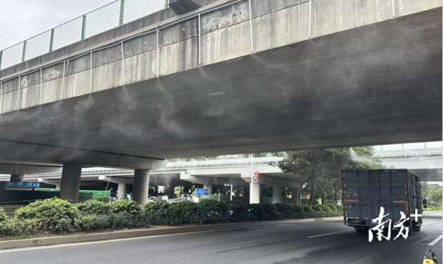 在車流量較大的機場高速與均禾大道、加石路交會處高速橋底,創新性安裝固定噴淋系統,設定每半小時噴淋一次、每次持續半小時的作業模式,對該區域道路揚塵起到顯著降塵效果,有效遏制“流動污染源”擴散。