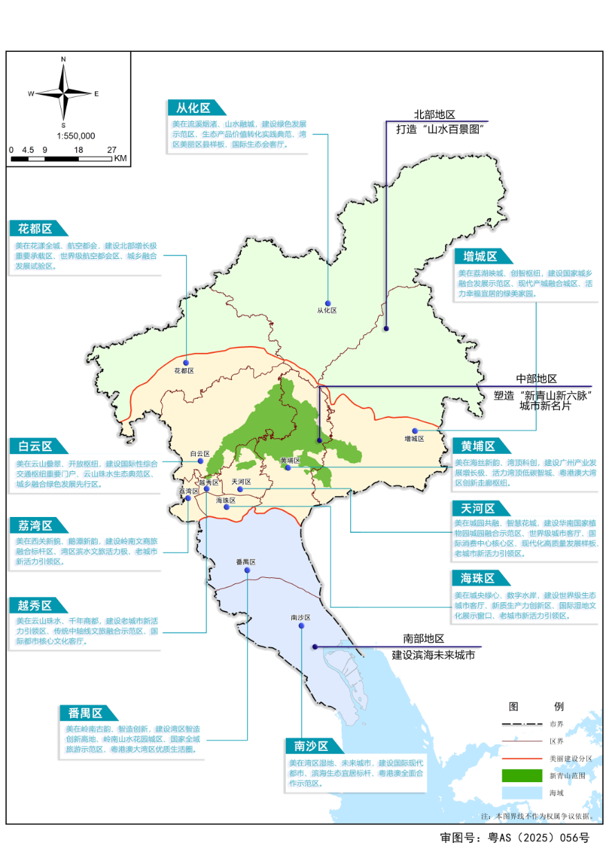 花都區:美在花漾全城、航空都會,建設北部增長極重要承載區、世界級航空都會區、城鄉融合發展試驗區。