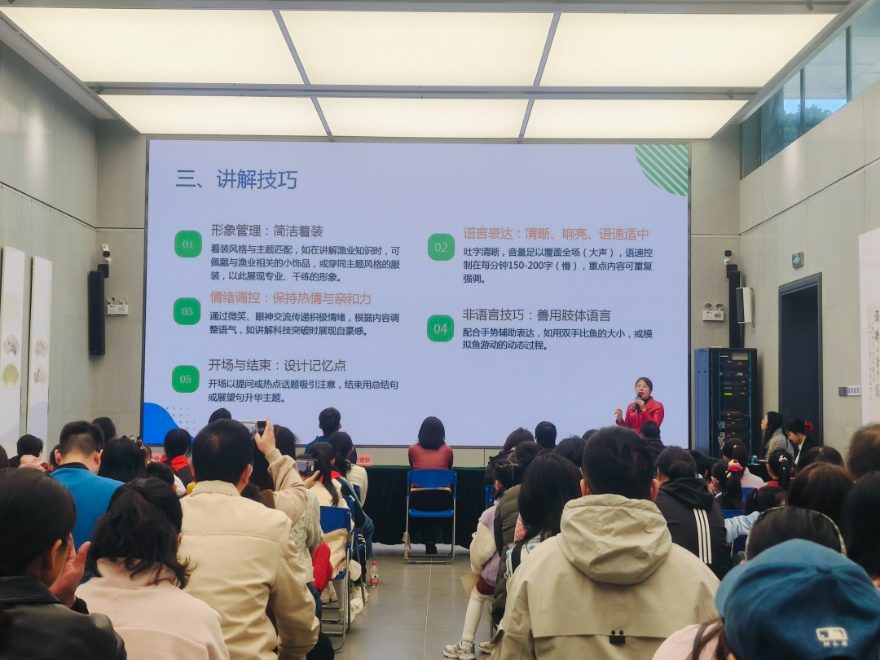 為提升小主播們的生態科普講解能力,現場,中國水產科學研究院珠江水產研究所高級實驗師、廣州市科普名師楊婉玲開展專題培訓。通過“理論講解+實地教學”模式,她帶領小主播們在文化公園水產館結合珍貴標本進行沉浸式學習,完成從知識獲取到實踐應用的全過程體驗,進一步增強了生態傳播的素養與熱情。