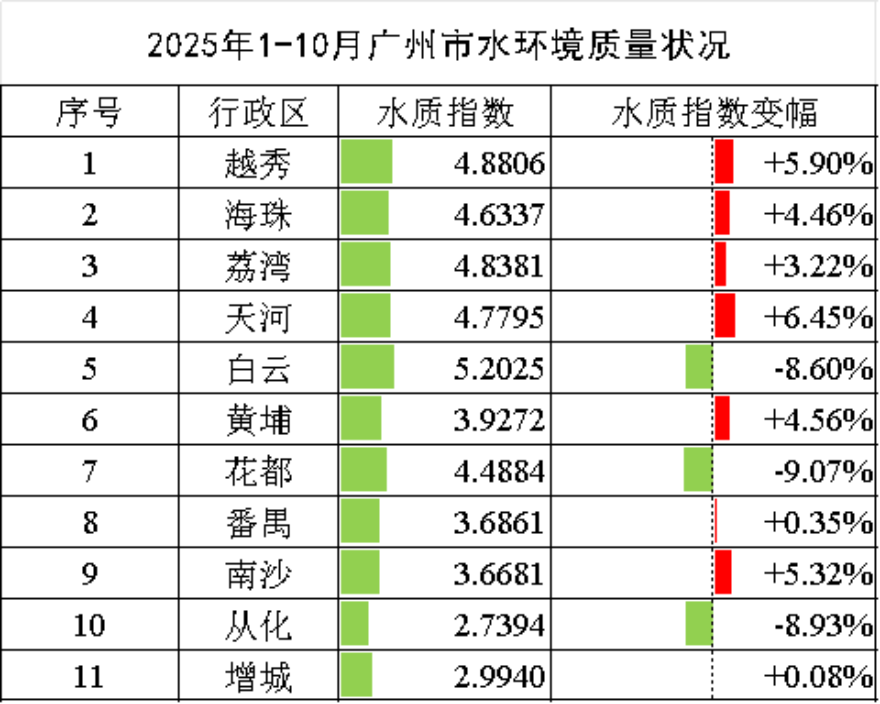 2025年1-10月,地表水環境質量狀況較好的為從化區、增城區、南沙區,較差的為白云區、越秀區、荔灣區。白云區、花都區、從化區3個區水環境質量同比有所改善。