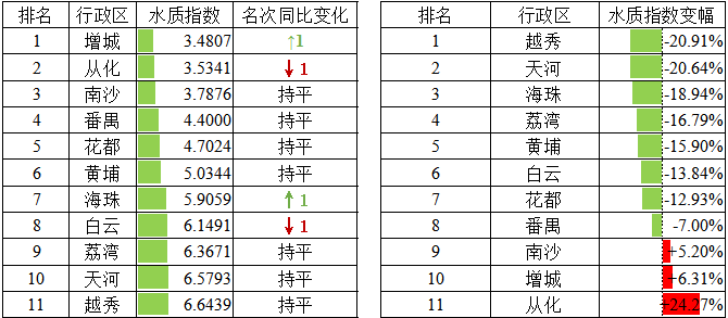2021年1月廣州市各區(qū)水環(huán)境質(zhì)量及變化排名