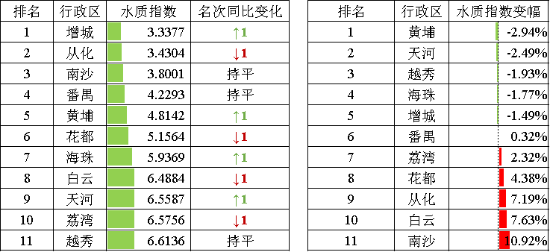 2021年1-3月,各區(qū)地表水環(huán)境水質(zhì)指數(shù)排名前三位為增城、從化、南沙,后三位為越秀、荔灣、天河。其中黃埔、天河、越秀等5個(gè)區(qū)水環(huán)境質(zhì)量同比有所改善。
