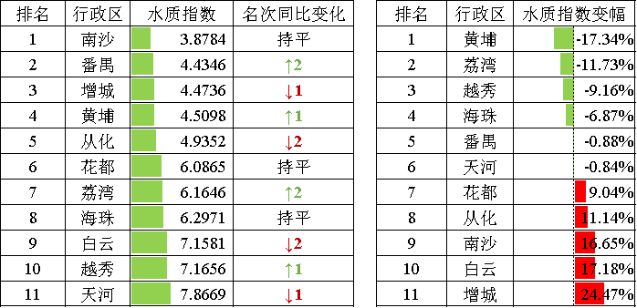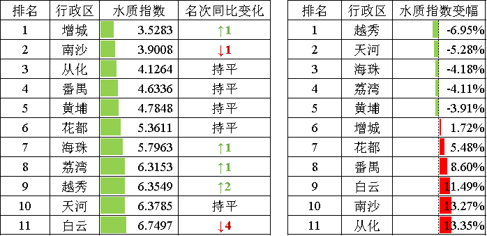 2021年1-6月,各區(qū)地表水環(huán)境水質(zhì)指數(shù)排名前三位為增城、南沙、從化,后三位為白云、天河、越秀。其中越秀、天河、海珠、荔灣、黃埔等5個區(qū)水環(huán)境質(zhì)量同比有所改善。