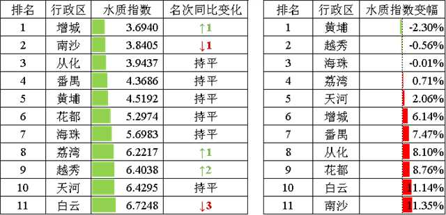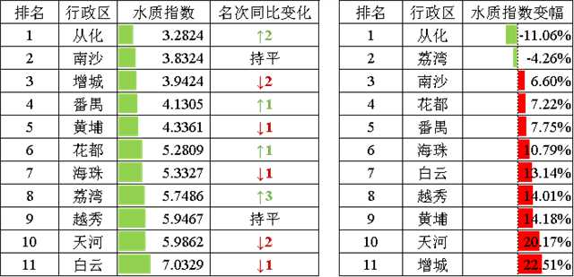 注:1.水質指數變幅為水質指數同比,小于0表示改善,大于0表示變差。