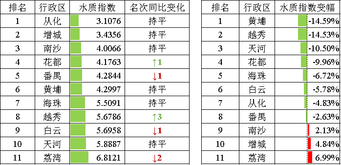2022年1月,各區地表水環境水質指數排名前三位為從化、增城、南沙,后三位為荔灣、天河、白云。其中,黃埔、越秀、天河、花都、海珠、白云、從化和番禺等8個區水環境質量同比有所改善。