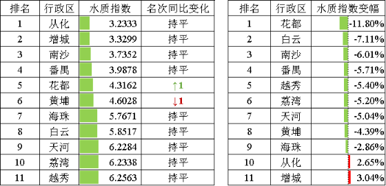 2022年1~3月,各區地表水環境水質指數排名前三位為從化、增城、南沙,后三位為越秀、荔灣、天河。其中花都、白云、南沙、番禺、越秀、荔灣、天河、黃埔、海珠等9個區水環境質量同比有所改善。