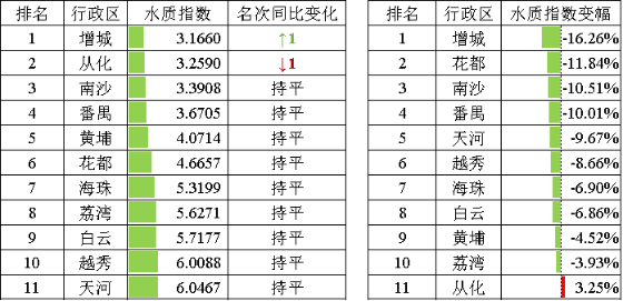 2022年1~9月,各區地表水環境水質指數排名前三位為從化、增城、南沙,后三位為天河、荔灣、越秀。全市11個區水環境質量同比均有所改善。