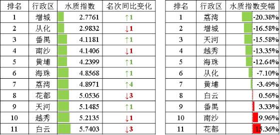 注:1.水質指數變幅為水質指數同比,小于0表示改善,大于0表示變差。