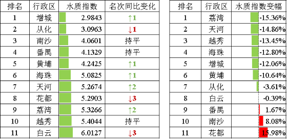 2023年1-4月,各區地表水環境水質指數排名前三位為增城區、從化區、南沙區,后三位為白云區、越秀區、荔灣區。8個區水環境質量同比有所改善,其中荔灣、天河、越秀、海珠、增城、黃埔等6個區水質改善幅度超過10%。