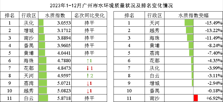 2023年1-12月,各區(qū)地表水環(huán)境水質(zhì)指數(shù)排名前三位為從化區(qū)、增城區(qū)、南沙區(qū),后三位為白云區(qū)、越秀區(qū)、荔灣區(qū)。10個(gè)區(qū)水環(huán)境質(zhì)量同比均有所改善,其中天河、越秀、海珠等3個(gè)區(qū)水質(zhì)改善幅度超過10%。