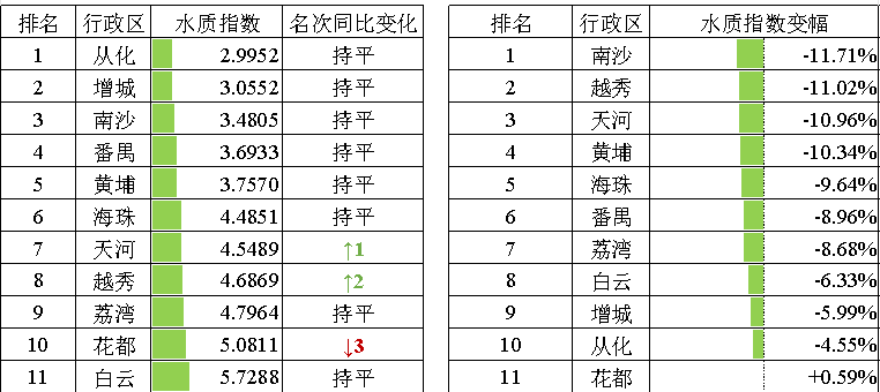 注: 1.水質指數變幅為水質指數同比,小于0表示改善,大于0表示變差。