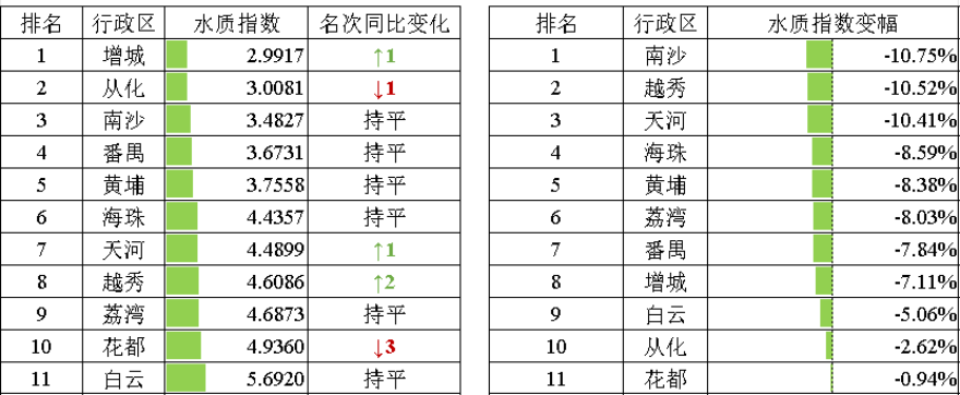 2024年1-10月,按照水質(zhì)指數(shù)由低到高排名,各區(qū)地表水環(huán)境水質(zhì)指數(shù)排名前三名為增城區(qū)、從化區(qū)、南沙區(qū),后三名(從倒數(shù)第1名至倒數(shù)第3名)為白云區(qū)、花都區(qū)、荔灣區(qū)。11個(gè)區(qū)水環(huán)境質(zhì)量同比均有所改善,其中南沙區(qū)、越秀區(qū)、天河區(qū)水質(zhì)改善幅度均超過(guò)10%。