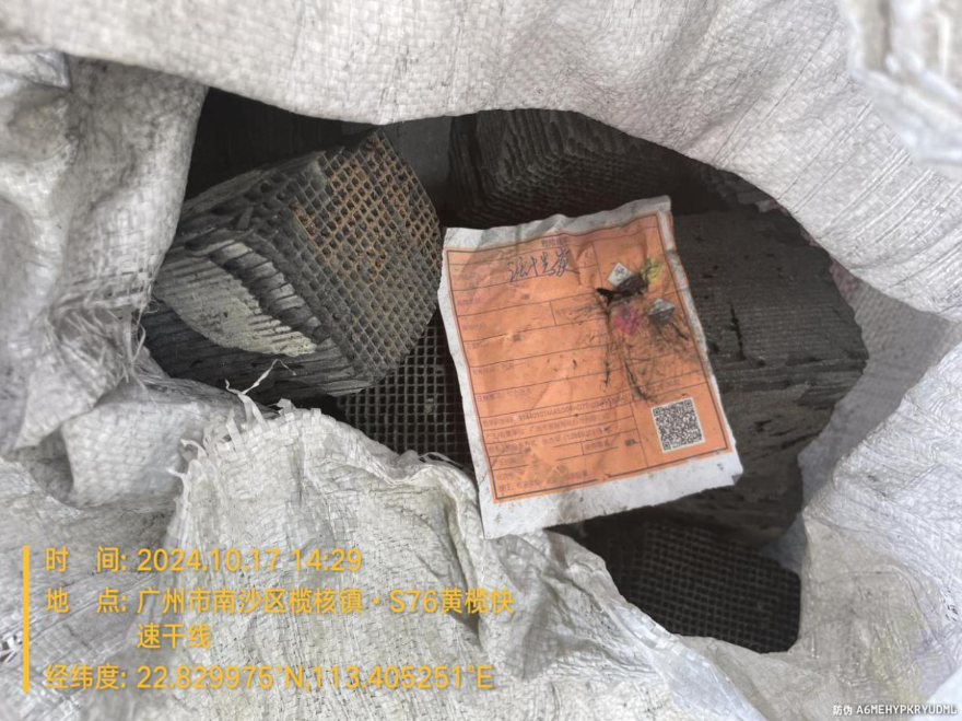 2024年10月17日,廣州市生態環境局南沙分局委托廣州市某環保科技有限公司對現場傾倒的袋裝污泥和廢活性炭進行應急處置。經過磅稱重,欖核鎮沙角村沙興路西側黃欖快速干線橋底傾倒的袋裝污泥重量為10.64噸,廢活性炭重量為320千克。