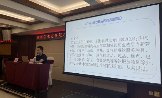 9月14日市生態(tài)環(huán)境局越秀分局組織在湖天賓館組織召開(kāi)《廣州市餐飲場(chǎng)所污染防治規(guī)定》專(zhuān)題培訓(xùn),梁龍金律師在授課