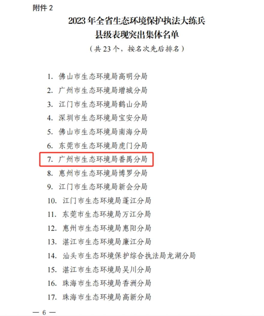 近日,廣東省生態環境廳通報表揚了2023年全省生態環境保護執法大練兵表現突出集體和個人,廣州市生態環境局番禺分局入選2023年全省生態環境保護執法大練兵縣級表現突出集體。近年來,該分局立足生態環境執法主責主業,在不斷加大對環境違法行為打擊力度的同時,內強素質、外優服務,全面提升執法能力建設和服務水平,為番禺區綠色低碳高質量發展提供堅強保障。