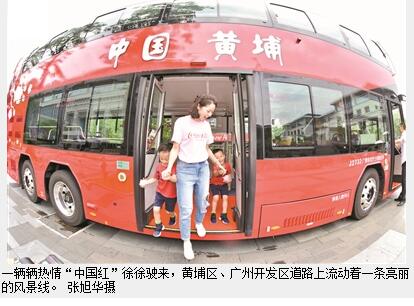 一輛輛熱情“中國紅”徐徐駛來,黃埔區、廣州開發區道路上流動著一條亮麗的風景線。從去年12月首批438輛“中國紅”純電動車投入運營,該區綠色公交腳步一路向前,昨日20輛純電動雙層巴士加入“333路”公交路線,壯大了新能源公交隊伍。