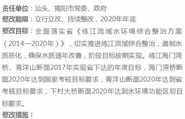 (四)汕頭市。落實《汕頭市水體達標方案(2016—2020年)》,練江海門灣橋閘斷面2020年水質達到國家考核目標要求。