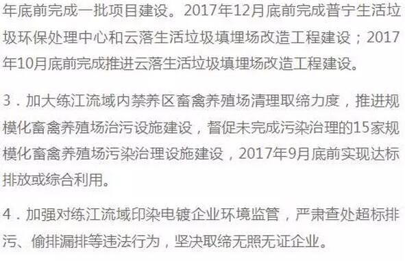 2.2017年9月底前,完成茅洲河流域內304公里污水管網建設和共和涌支流綜合整治工程。2017年底前,完成673公里污水管網建設和鵝頸水、木墩河支流綜合整治工程。2018年6月底前,建成沙井水質凈化廠二期、松崗水質凈化廠二期工程,光明水質凈化廠二期工程實現生產線通水。2018年6月底前,將茅洲河流域約30萬噸/日直排污水全部收集處理,茅洲河干流消除黑臭,最大程度改善河流水環境質量。