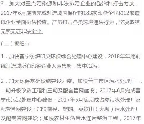(六)揭陽市。開展全市飲用水源保護區拉網式排查,建立飲用水源保護區違法建設項目和其他違法建筑整治清單,按省的統一要求落實整改。2017年6月底前,依法關閉仙庵鎮頂溪村大尖山釆石場、點埔釆石場,積極做好水土保持、復綠等生態修復工作。