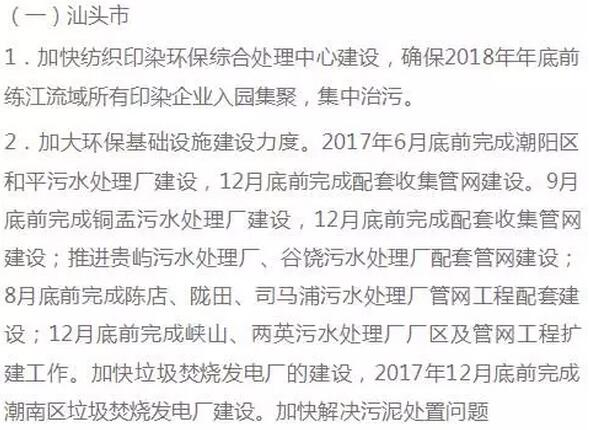 (一)加快完成污水處理廠擴建及提標改造工程。鳳崗竹塘二期項目2017年7月底前完工。塘廈林村二期項目2017年8月底前完成主體工程。2017年9月底前完成配套管網并通水,樟木頭三期項目2018年8月底前完工,清溪長山頭二期項目2018年6月底前完工,流域內11家污水處理廠提標工程2018年年底前完工。