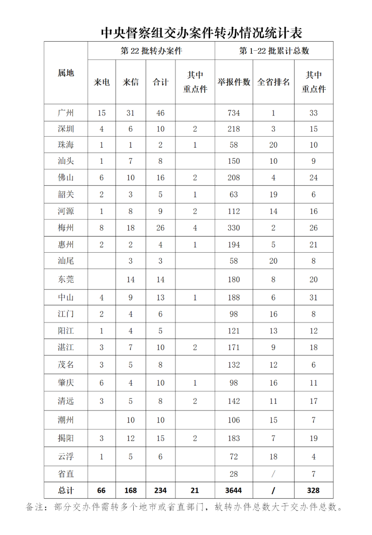 9月18日,中央第四生態環境保護督察組向廣東交辦第22批涉及環境領域群眾舉報案件234件(來電66件,來信168件),其中列為重點關注案件21件(梅州4件,深圳、佛山、河源、湛江、清遠、揭陽各2件,珠海、韶關、惠州、中山、肇慶各1件)。