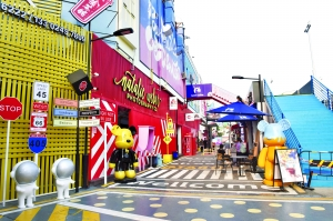 彩虹街有兩層,二層有綠色的草坪、藍色的圍欄以及不同色彩的樓梯,還有卡通涂鴉墻,墻上繪有人們熟知的卡通形象和原創的涂鴉,在藍天白云的映襯下,顯得格外小清新。這里的店鋪門面很有特色,也是凹造型的好地方。